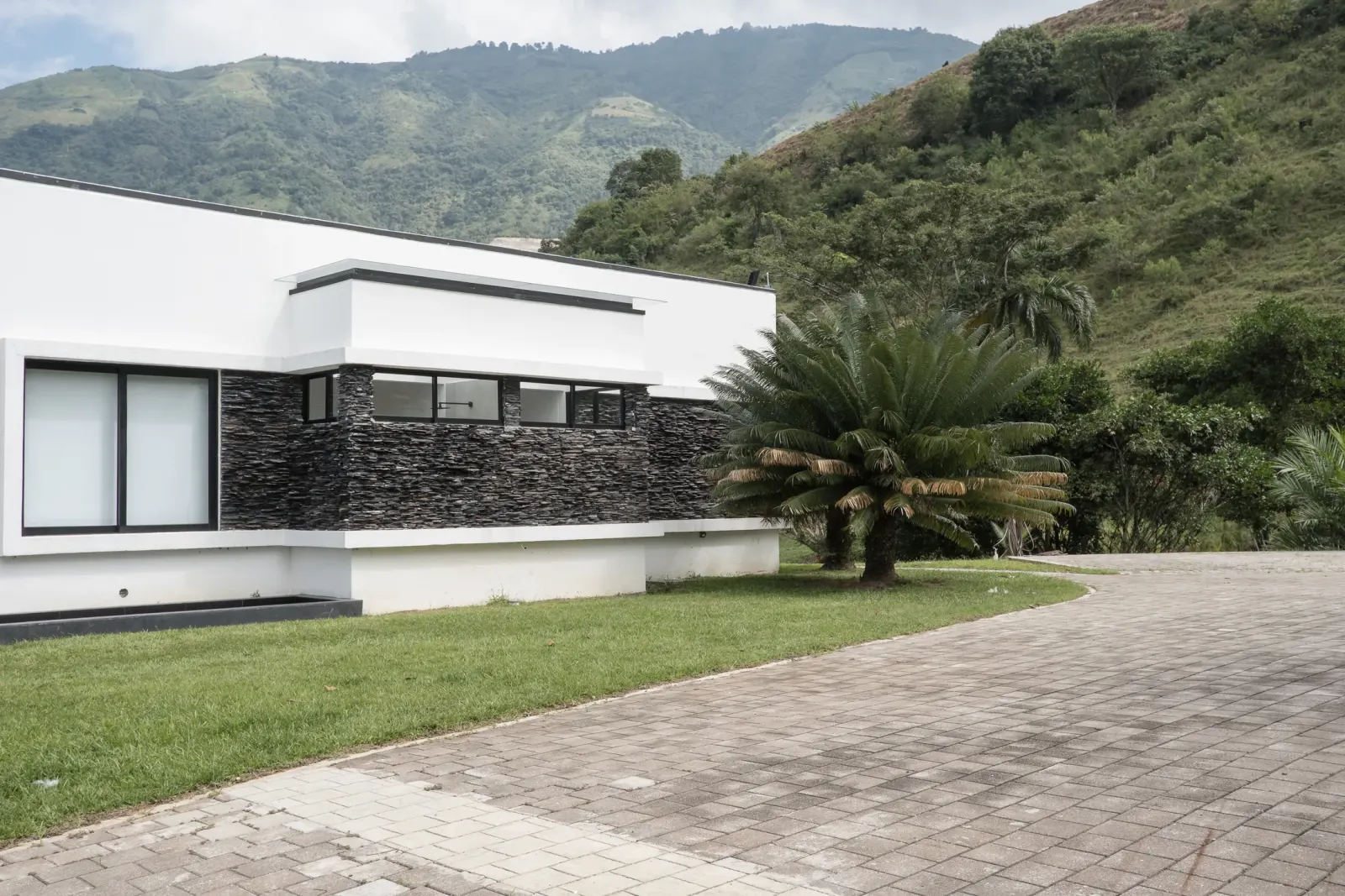 The exterior reads as disciplined and calm before the sequence opens into softer interior light.